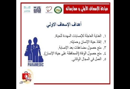 كما تناول البرنامج توضيح معنى الإسعافات الأولية وأنواعها من حيث الإسعاف الأولي، الإسعاف الطبي، المسعف الأولي، المسؤول عن تقديم الإسعافات الأولية، صفات المسعف، المبادئ العامة للإسعافات الأولية وممارساته، القواعد الأساسية في الإسعاف الأولي، ومن ثم تم استعراض بعض الإصابات وطرق إسعافها، وشرح الحقيبة الإسعافية ومكوناتها وأهميتها، وتصحيح بعض العادات الإسعافية الخاطئة.