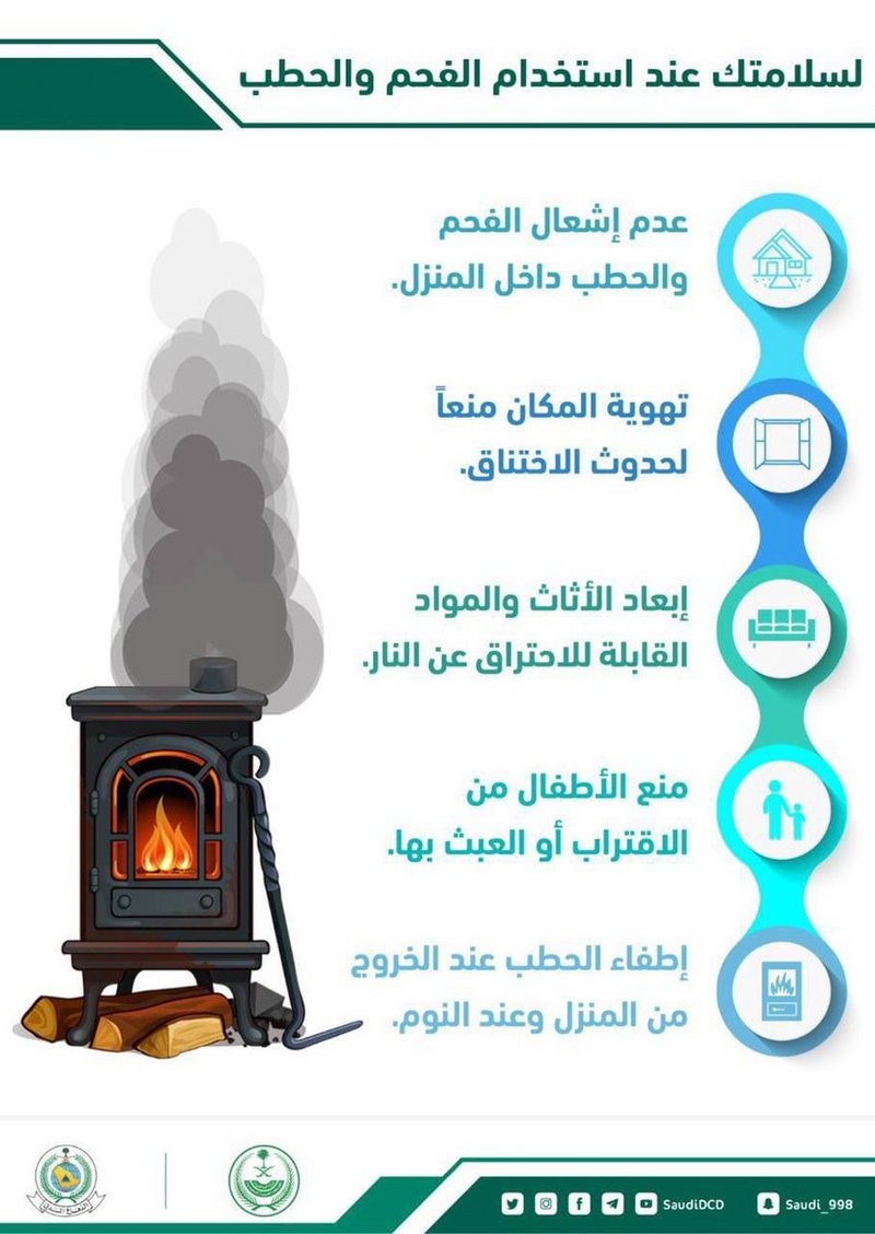 نصحت المديرية العامة للدفاع المدني، بالقيام بخمسة أمور عند استخدام الفحم أو الحطب، حفاظًا على السلامة.