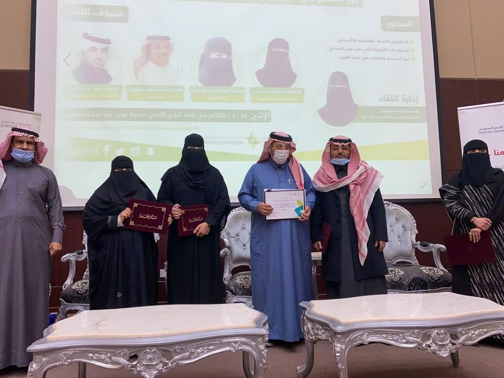 في عدة محاور حيث تحدث الدكتور سعود جبيب الرويلي عن المفاهيم الحديثة في الوسطية والتسامح وذكر بأن مفاهيم الوسطية ليست جديدة وإنما في فترة من الزمن غيبت بسبب بعض السلوكيات والمفاهيم الخاطئة ولكن الان تعود للفهم الصحيح كما تطرق الدكتور على ان القيم تسير راسيًا عمقًا للتاريخ وأفقيًا وفق لاختلاف المجتمعات كذلك شاركت الاستاذة مرام فهد المشاري بالحوار بمحور الممارسات التربوية في تعزيز القيم بقولها هناك العديد من الممارسات التي تعزز القيم والوسطية في المجتمع ولابد أن تكون المدرسة القدوة للجميع كذلك تحدث الأستاذ محمد داود العطيوي عن دور المدرسة في تعزيز الوسطية وذكر بعض النماذج الحية في تجسيد الوسطية كما تطرقت الاستاذة فاطمه الشمراني عن دور المعلم و ربطها باخلاقيات مهنة التعليم . وقد ادارت الحوار مشرفة مركز الملك عبدالعزيز للحوار الوطني الاستاذة باسمه الضويمر كما اثري اللقاء من خلال مداخلات من الحضور كان لها الاثر الجيد على الحوار وفي الختام كرم مشرف الحوار الوطني الأستاذ خالد الفريجي الرويلي المشاركين في الحوار كما كرم مدير عام فرع هيئة الهلال الاحمر بمنطقة الحدود الشمالية الدكتور ثامر اسماعيل يتيم .