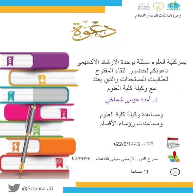 برعاية وكيلة كلية العلوم د. آمنة شماخي أقامت وحدة الإرشاد الأكاديمي لقاءً مفتوحًا مع الطالبات المستجدات، لتوضيح أنظمة الجامعة وتعريف الطالبات بما لهم وما عليهم.