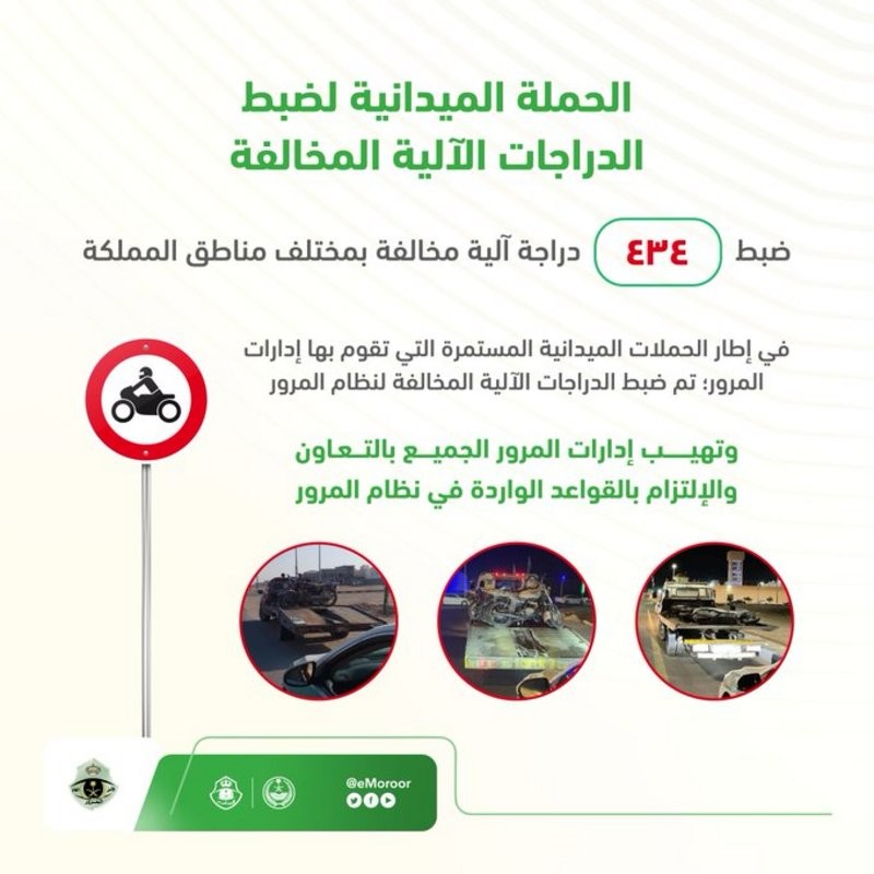 نفّذت إدارات المرور بمختلف مناطق المملكة حملة ميدانية لضبط الدرّاجات الآلية المخالفة، التي أسفرت عن ضبط 434 مخالفة.