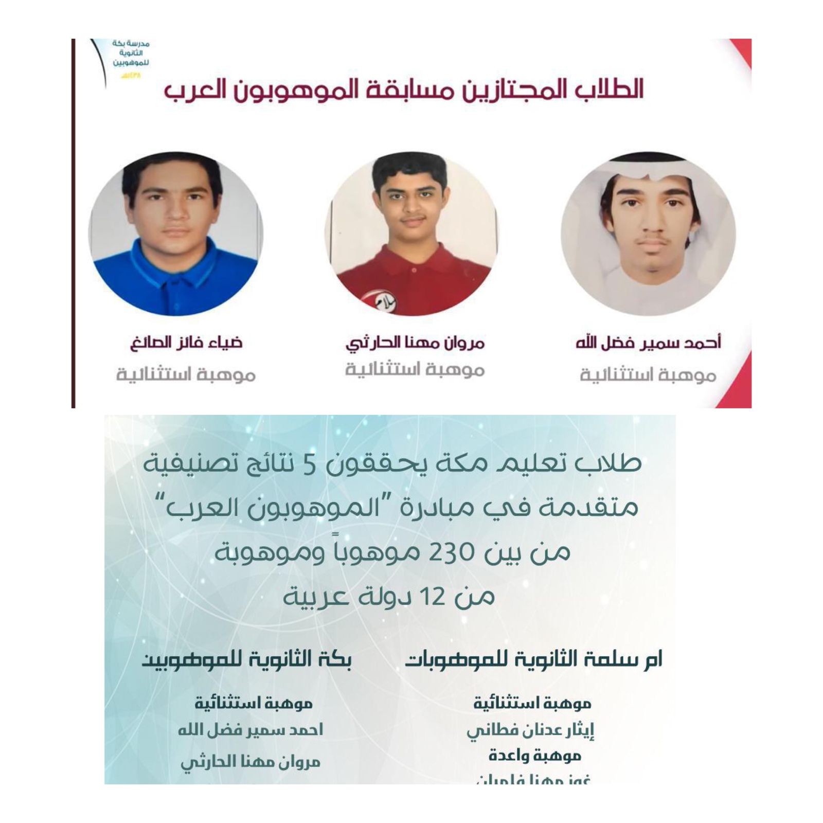 ‏وكان الطلاب مروان مهنا الحارثي ؛ وأحمد سمير فضل الله ؛ وضياء فائز الصائغ من ثانوية بكة للموهوبين والطالبة إيثار عدنان فطاني وغوز مهنا فلمبان من ثانوية أم سلمة للموهوبات تم إعلان أسماؤهم  في إعلان نتائج النسخة الأولى من مبادرة الموهوبون العرب في الحفل الذي الذي أقامته مؤسسة الملك عبدالعزيز ورجاله للموهبة والإبداع "موهبة"، والمنظمة العربية للتربية والثقافة والعلوم "الألكسو" بحضور معالي الدكتور سعود بن سعيد المتحمي الأمين العام لـ"موهبة"، ومعالي المدير العام للمنظمة العربية للتربية والثقافة والعلوم "الألكسو" الدكتور محمد ولد أعمر، ورئيس المجلس التنفيذي للمنظمة هاني المقبل ؛ حيث تهدف  مبادرة "الموهوبون العرب"، إلى نشر ثقافة الموهبة ودعم رعاية الموهوبين في العالم العربي حيث جاء عدد الطلبة الموهوبين المكتشفين 230 موهوباً ( 60 موهبة استثنائية ؛ 87 موهوباً ؛ 83 واعداً بالموهبة )
