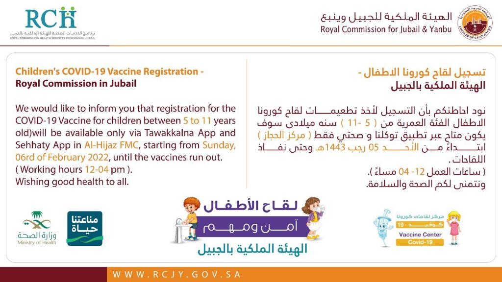 أعلنت الهيئة الملكية بالجبيل ممثلة في برنامج الخدمات الصحية عن توفر لقاح الأطفال للفئة العمرية من امر (٥-١١) سنة ميلادي بدءا من يوم الأحد القادم في مركز الحجاز الصحي وحتى نفاذ اللقاح .