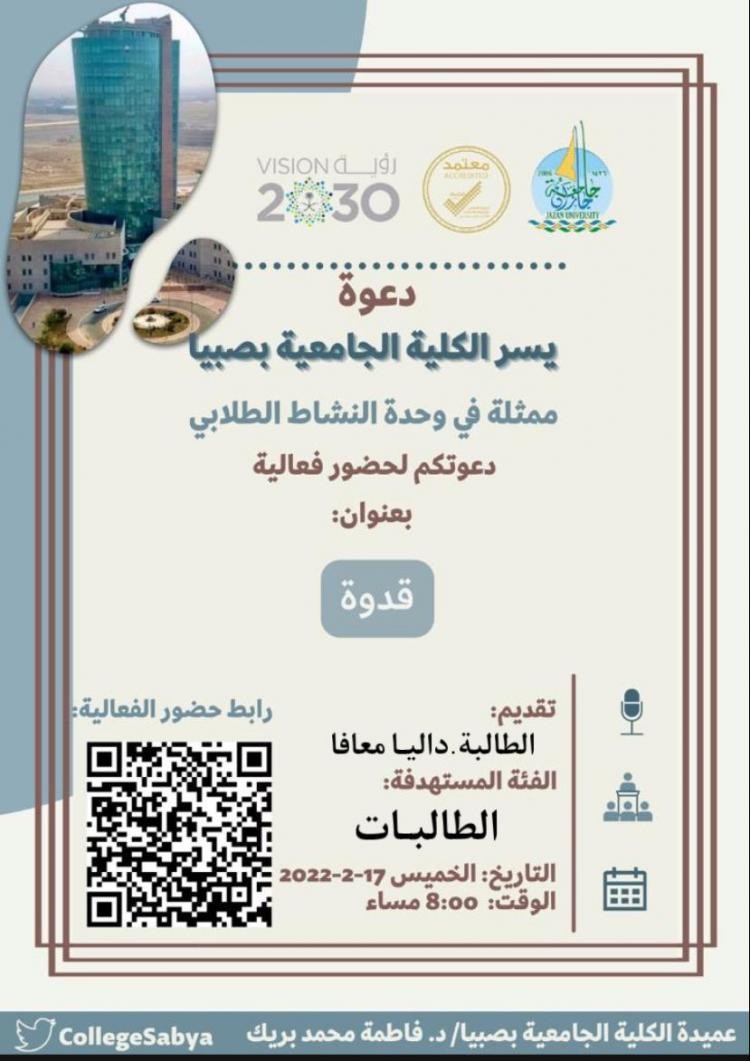 نفذت الكلية الجامعية بصبيا ممثلة بوحدة النشاط الطلابي وبإشراف العميدة د. فاطمة بريك فعالية قدوة قدمتها الطالبة: داليا أحمد معافا عبر تطبيق زوم.