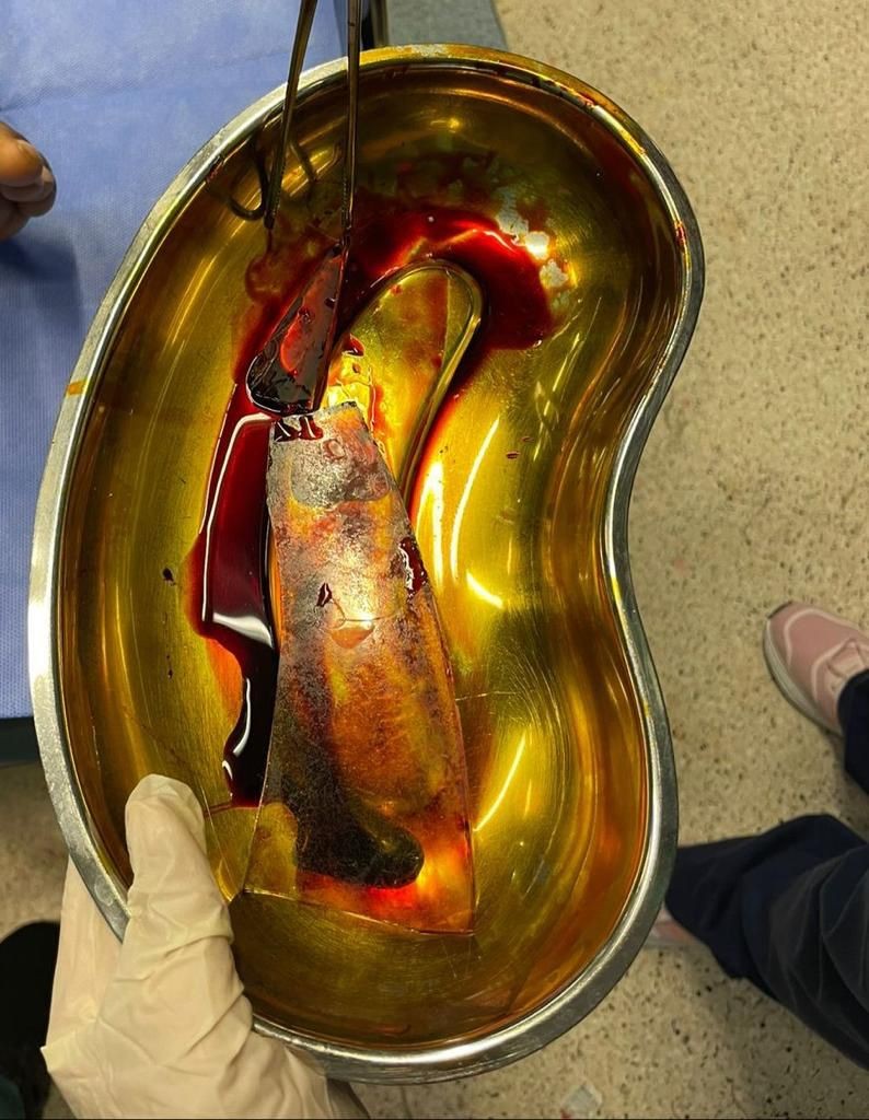 وبعد الكشف وإجراء الفحوصات اللازمة ومعاينتها تبين وجود قطعة زجاجية داخل الجرح في أسفل الظهر، وقد اخترقت عضلات الظهر ووصلت للبطن، نتيجة سقوط المريضة على طاولة زجاجية، مما تسبب بجرح في إحدى الأوعية الدموية الصغيرة المغذية للقولون، بالإضافة إلى وجود قطع في الأوعية المغذية للكلية وجرح قطعي بالكلية نفسها.