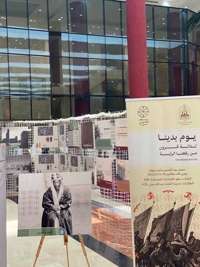 والذي يستمر لمدة يومين، في بهو المبنى الرئيس بمدينة الملك عبد الله للطالبات بمشاركة عدد من الكليات و العمادات والإدارات، وبحضور قياديات و منسوبات الجامعة والطالبات، يأتي ذلك تأكيداً لأهمية هذا اليوم والذي يعكس الإرث التاريخي والعمق الحضاري فضلاً عن الإرث الثقافي والاجتماعي للدولة السعودية حتى وقتنا الحاضر.