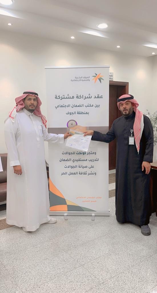 إنطلاقا من مبدأ الشراكة المجتمعية بين القطاعات الحكومية والقطاع الخاص لتحقيق اهداف الرؤية 2030 وضمن جهود مكتب الضمان الاجتماعي بمنطقة الجوف من خلال قسم التمكين بالمكتب تم توقيع عقد شراكة وتعاون بين المكتب ومثله بالتوقيع مدير المكتب الاستاذ /زياد الدرعان مع متجر كونكت للاتصالات ومثله الاستاذ/ سامي الفهيقي .