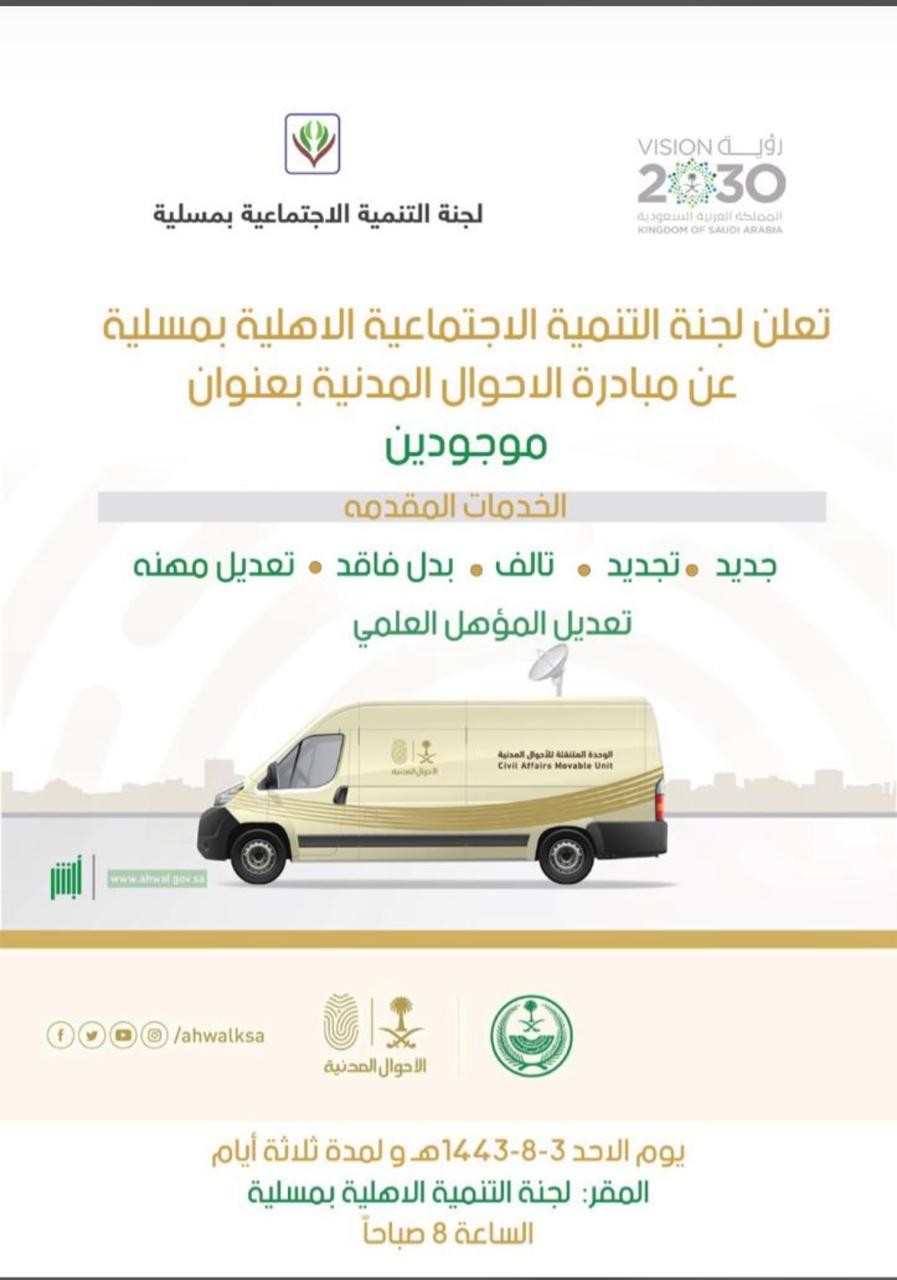 اجتمع بالأمس أعضاء وعضوات لجنة التنمية الإجتماعية (الأهلية) بمسلية ، وتمت مناقشة تفعيل عربة الأحوال المدنية لمدة ثلاثة أيام كحد أدنى ، وتمت مخاطبة إدارة الأحوال المدنية بمنطقة جازان وبادرو بسرعة الاستجابة والموافقة على طلب اللجنة .
