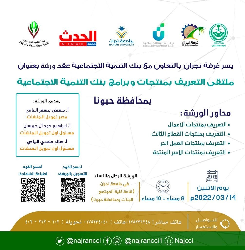 تعتزم غرفة نجران بالتعاون مع بنك التنمية الاجتماعية عقد ورشة بعنوان "ملتقى التعريف بمنتجات وبرامج بنك التنمية الاجتماعية" في محافظة حبونا ، وذلك يوم الإثنين الموافق 14 من الشهر الجاري ، في تمام الساعة الثامنة مساء.