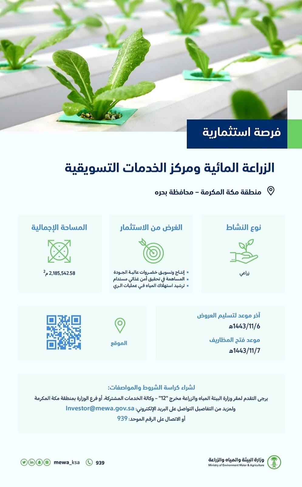 أوضحت وزارة البيئة والمياه والزراعة، عن طرح فرصة استثمارية للزراعة المائية ومركز الخدمات التسويقية بمحافظة بحره بمنطقة مكة المكرمة.