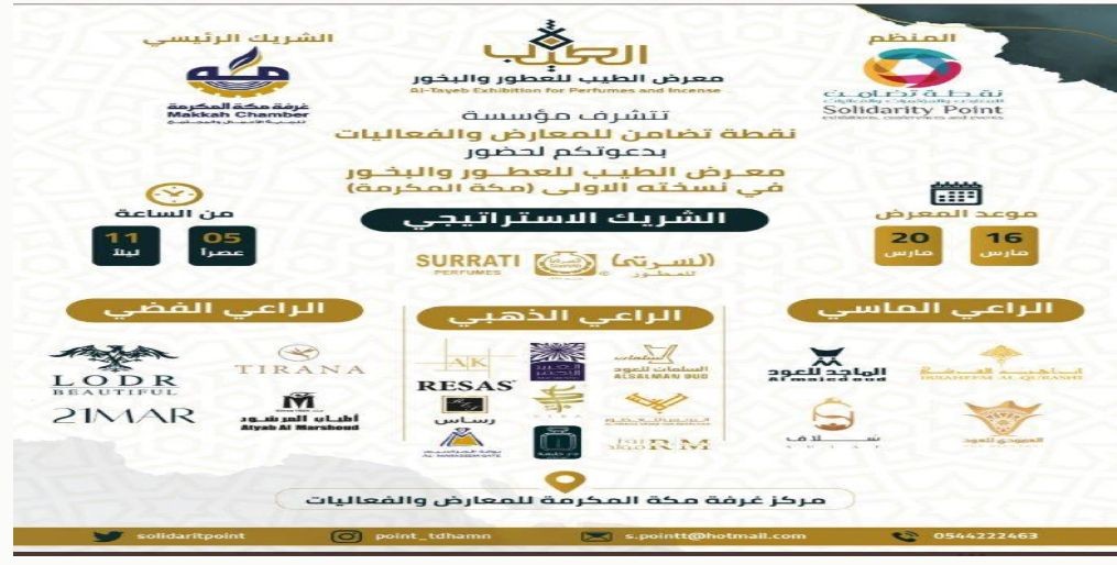 تنطلق غداً من مركز غرفة مكة المكرمة للمعارض والفعاليات أعمال "معرض الطيب للعطور والبخور" بمشاركة أكثر من 50 من منتجي وبائعي العطور ومشتقاتها في المملكة ودول الخليج العربية، لمدة خمسة أيام.