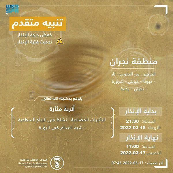 المركز الوطني للأرصاد: أتربة مثارة على منطقة نجران