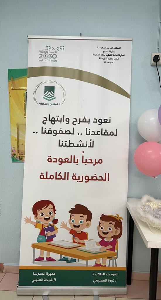 استقبلت المتوسطة الثانية والأربعون التابعة لمكتب تعليم شرق مكة بالإدارة العامة للتعليم بمنطقة مكة المكرمة طالباتها للفصل الدراسي الثالث وذلك صباح اليوم الأحد الموافق 1443/8/17هـ بنسبة حضور ١٠٠٪ من الطالبات ، كما شهدت المدرسة الاصطفاف الصباحي لهن تحت إشراف مديرة المدرسة شيخة القثامي .