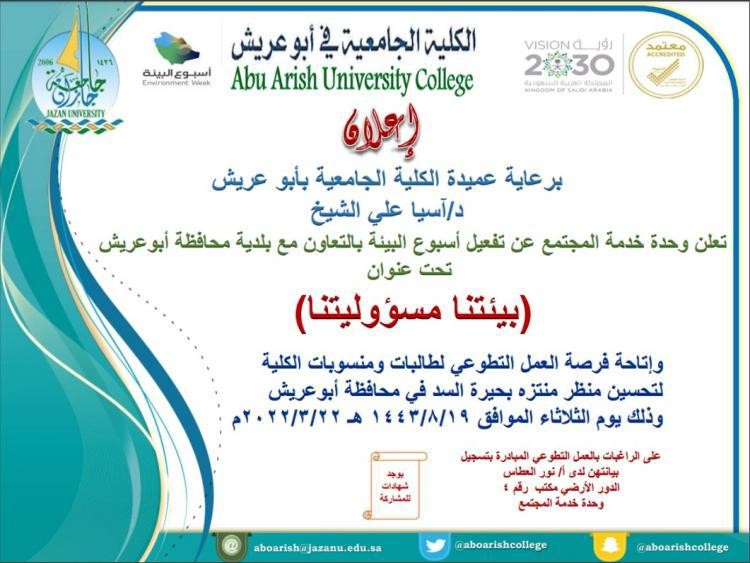 الكلية الجامعية بأبو عريش تزامنًا مع أسبوع البيئة قامت وحدة خدمة المجتمع بالكلية الجامعية بأبي عريش بتوجيهات عميدة الكلية الدكتورة آسيا علي حيدر الشيخ بالتعاون مع بلدية محافظة أبو عريش بتفعيل مبادرة تحت شعار (بيئتنا مسؤوليتنا) من خلال تعاون طالبات ومنسوبات الكلية مع عمال النظافة برئاسة منسقة وحدة خدمة المجتمع المحاضرة نور العطاس لتحسين منظر منتزه بحيرة السد في محافظة أبو عريش يوم الثلاثاء 20-8-1443هـ.
