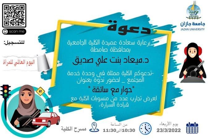 برعاية عميدة الكلية د. ميعاد بنت علي صديق، نفذت الكلية الجامعية بمحافظة صامطة ممثلة في وحدة خدمة المجتمع لقاء بعنوان (حوار مع سائقة)، لعرض عددٍ من تجارب طالبات الكلية في قيادة السيارة. حيث يعتبر يوم ١٤٣٩/١٠/١٠هـ يوماً مميزاً تستذكره المرأة السعودية في احتفالاتها الخاصة مثل اليوم العالمي للمرأة لأنه أوضح دعم القيادة الحكيمة للمرأة وتمكينها للإبداع بمختلف المجالات، وإعطائها كافة حقوقها لتكون عنصراً فعالاً في المجتمع، الأمر الذي يؤكد استمرار مسيرة الإصلاح والتنمية في السعودية، دون التعارض مع الالتزام الشرعي والأخلاقي.