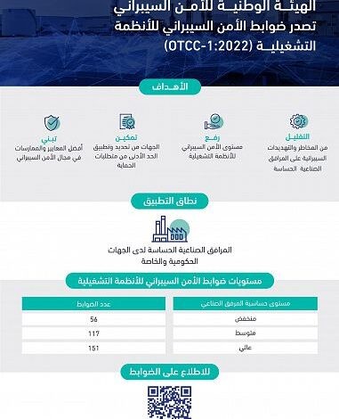 وأوضحت الهيئة أن الوثيقة تحدد الضوابط المعتمدة للأنظمة التشغيلية وأهدافها المتمثلة بالتقليل من المخاطر السيبرانية على المرافق الصناعية الحساسة التي تستخدم الأنظمة التشغيلية لرفع مستوى الأمن السيبراني وتمكين الجهات المعنية من تطبيق الحد الأدنى من متطلبات الحماية، كما تتضمن نطاق العمل وآلية المتابعة والالتزام بها، حيث تعد امتداداً للضوابط الأساسية للأمن السيبراني.