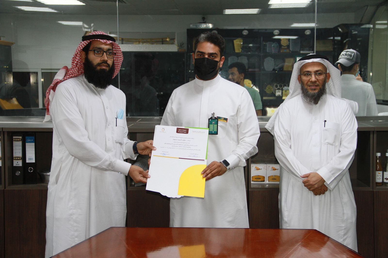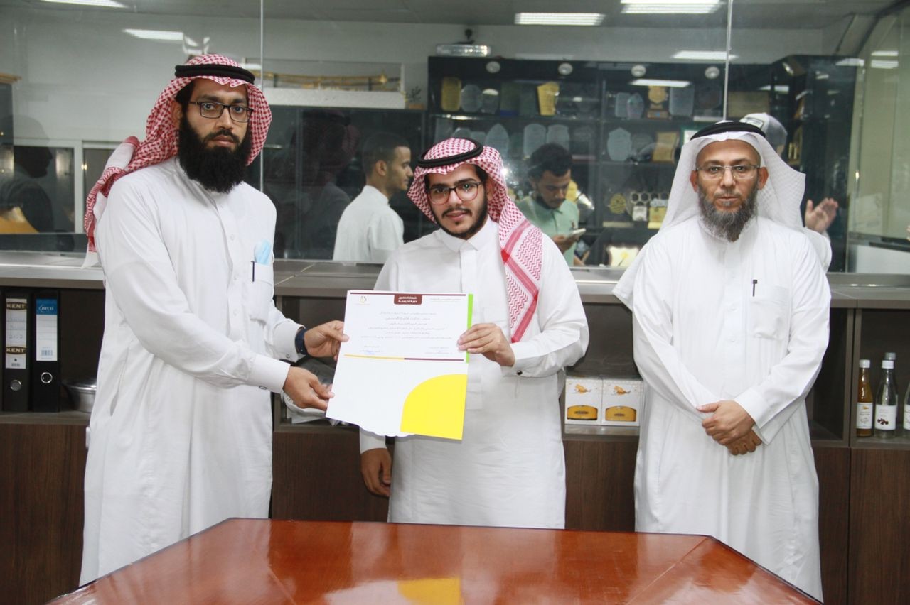 سلم المدير العام لمختبر مقاييس الجودة احمد القثامي مساء أمس شهادات حضور دورة لأكثر من 30 طالب من طلاب قسم الكيمياء بالكلية الجامعية بالجموم بحضور رئيس القسم الدكتور سامي الحربي.