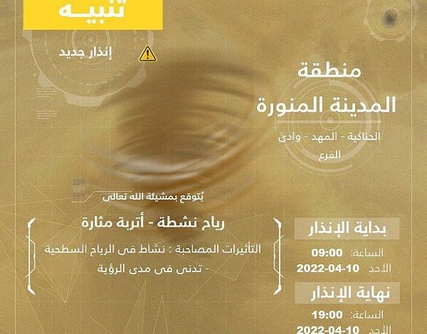 أصدر المركز الوطني للأرصاد تنبيهًا بشأن حالة الطقس اليوم بمنطقة المدينة المنورة – بمشيئة الله – تضمنت وجود رياح نشطة وأتربة مثارة, تشمل تأثيراتها تدنيًا في مدى الرؤية، على المدينة المنورة ومحافظات بدر، والحناكية، والمهد، ووادي الفرع.