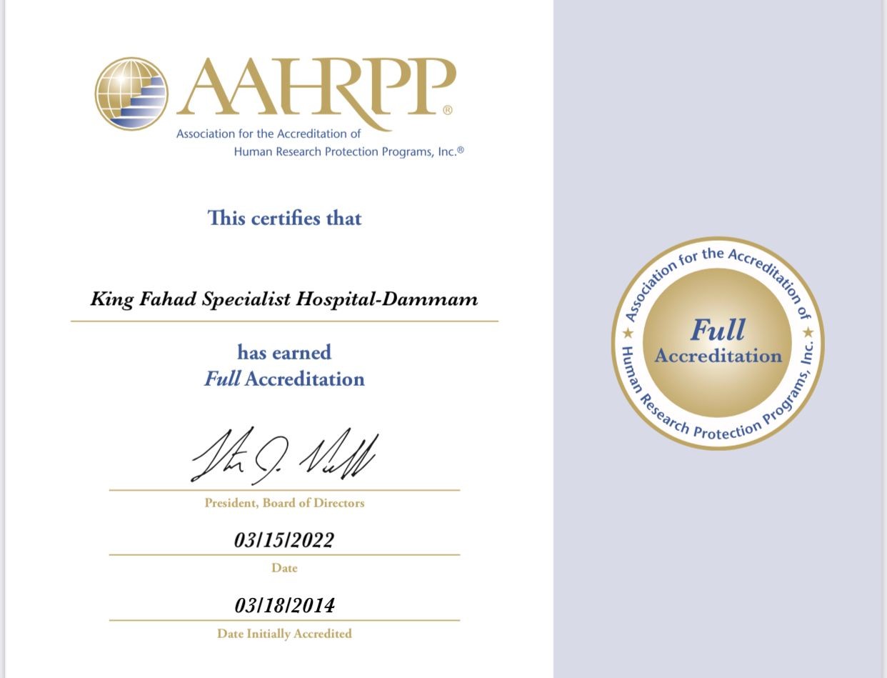 حصل مستشفى الملك فهد التخصصي بالدمام على اعتماد برنامج حماية المشاركين في الأبحاث البشرية للمرة الثالثة بعد ان حصل عليها في العام 2014 والعام 2017 على مستوى الشرق الأوسط وشمال افريقيا وتركيا كأول منشأة طبية تحصل على هذا الاعتماد .