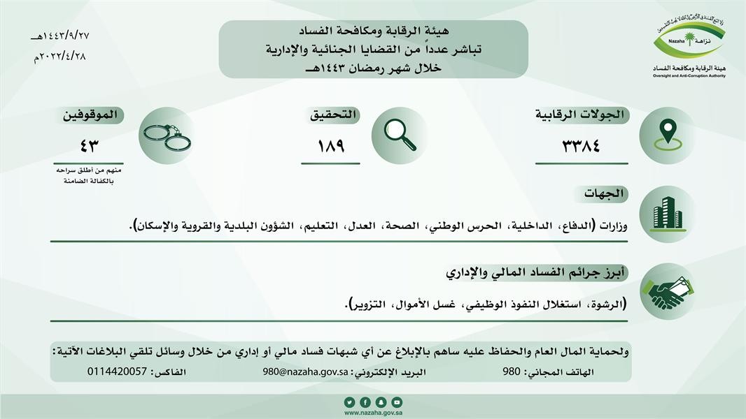 باشرت هيئة الرقابة ومكافحة الفساد "نزاهة" عدداً من القضايا الجنائية والإدارية خلال شهر رمضان 1443 هـ، وبلغ عدد من تم التحقيق معهم 189 متهما، فيما أوقفت 43 متهما، وفقاً لنظام الإجراءات الجزائية ومنهم من أطلق سراحه.