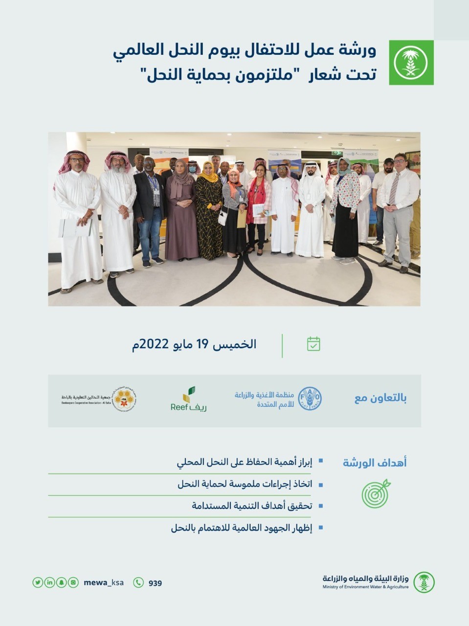 أقامت وزارة البيئة والمياه والزراعة بالتعاون مع برنامج التنمية الريفية الزراعية المستدامة (ريف)، وجمعية النحالين التعاونية بالباحة، ومنظمة الأغذية والزراعة للأمم المتحدة (فاو)، بالرياض اليوم، ورشة عمل بمناسبة الاحتفال بيوم النحل العالمي، تحت شعار (ملتزمون بحماية النحل).