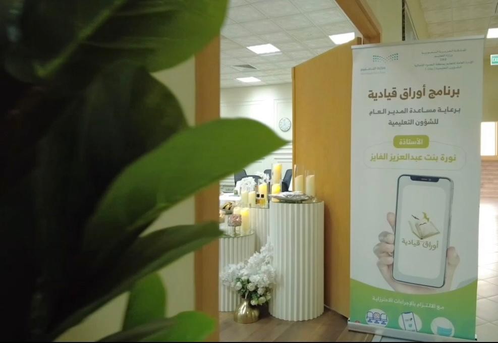 برعاية مساعد المدير العام للشؤون التعليمية (بنات) الأستاذة نوره عبد العزيزالفايز وحضور مديرات الإدارات والمشرفات التربويات وقيادات من كلية التقنية والغرفة التجارية والتنمية الاجتماعية والأحوال المدنية نفذ فريق برنامج أوراق قيادية (الورقة الختامية) في قاعة قيادات .حيث بدأ الحفل الختامي للبرنامج باية من الذكر الحكيم ثم حديث شريف وبدأت الفقرات بمقدمة من الأستاذة فوزة نايف عن القيادة حيث قدمة ورقتها الأستاذة مرام مشاري بعنوان مهارات القائد قدم بعدها الفريق نشاط عن المادة السابقة وقدمت جوائز للفائزين فيها .