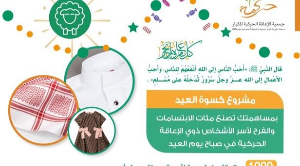 أطلقت جمعية الإعاقة الحركية للكبار "حركية " مشروع "كسوة العيد " للأشخاص ذوي الإعاقة الحركية من مستفيدي الجمعية وأسرهم بغرض إضفاء السعادة لهم صباح يوم عيد الأضحى المبارك .