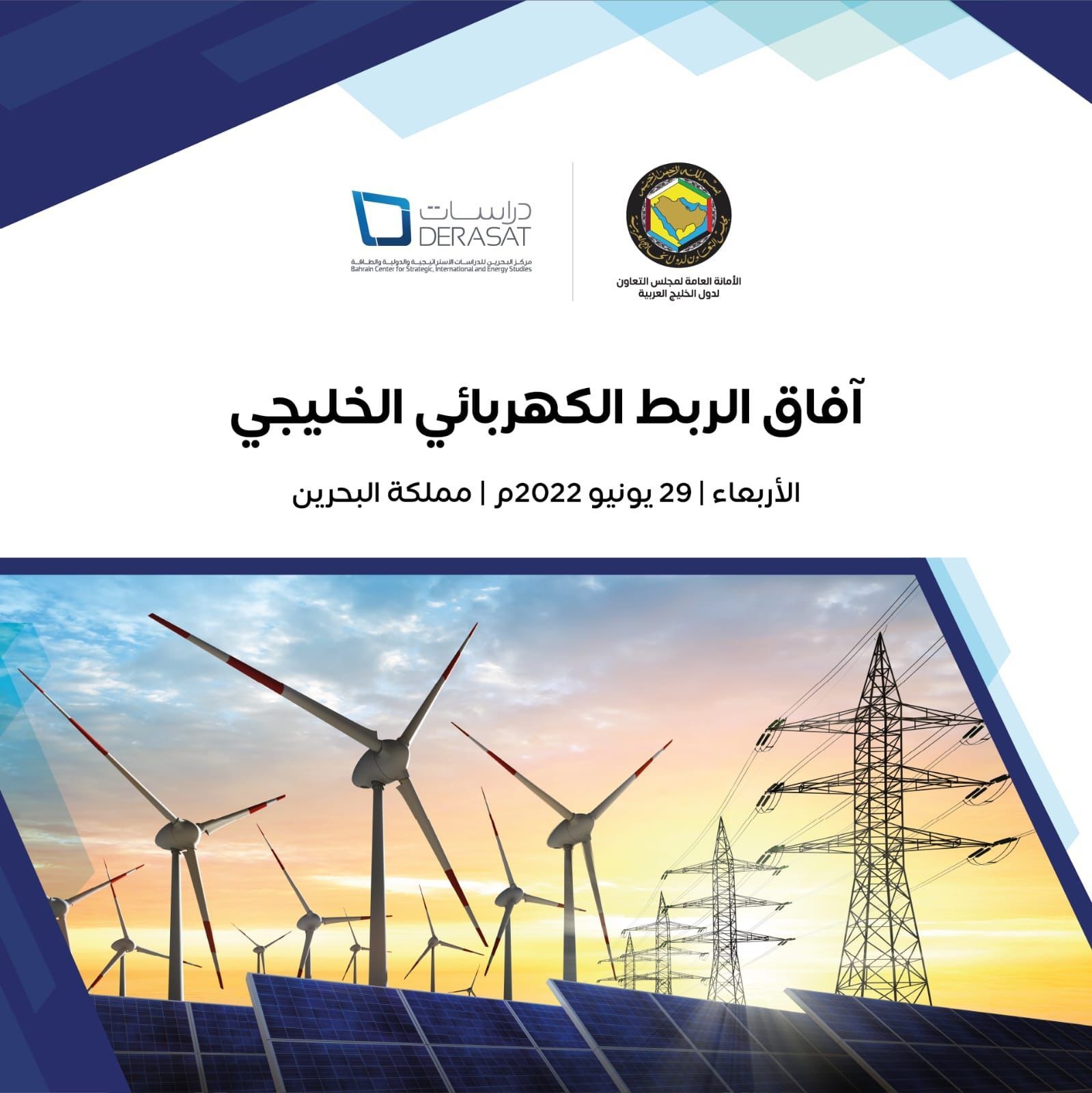 تتويجاً للشراكة البحثية بين الأمانة العامة لمجلس التعاون لدول الخليج العربية ومركز البحرين للدراسات الاستراتيجية والدولية والطاقة "دراسات"، سيتم تنظيم ندوة مشتركة بعنوان "آفاق الربط الكهربائي الخليجي"، بالتعاون مع هيئة الربط الكهربائي لدول مجلس التعاون لدول الخليج العربية وعددٍ من المؤسسات العامة والخاصة في المنطقة، يوم الأربعاء 29 يونيو 2022م، بمقر مركز "دراسات" في منطقة العوالي.