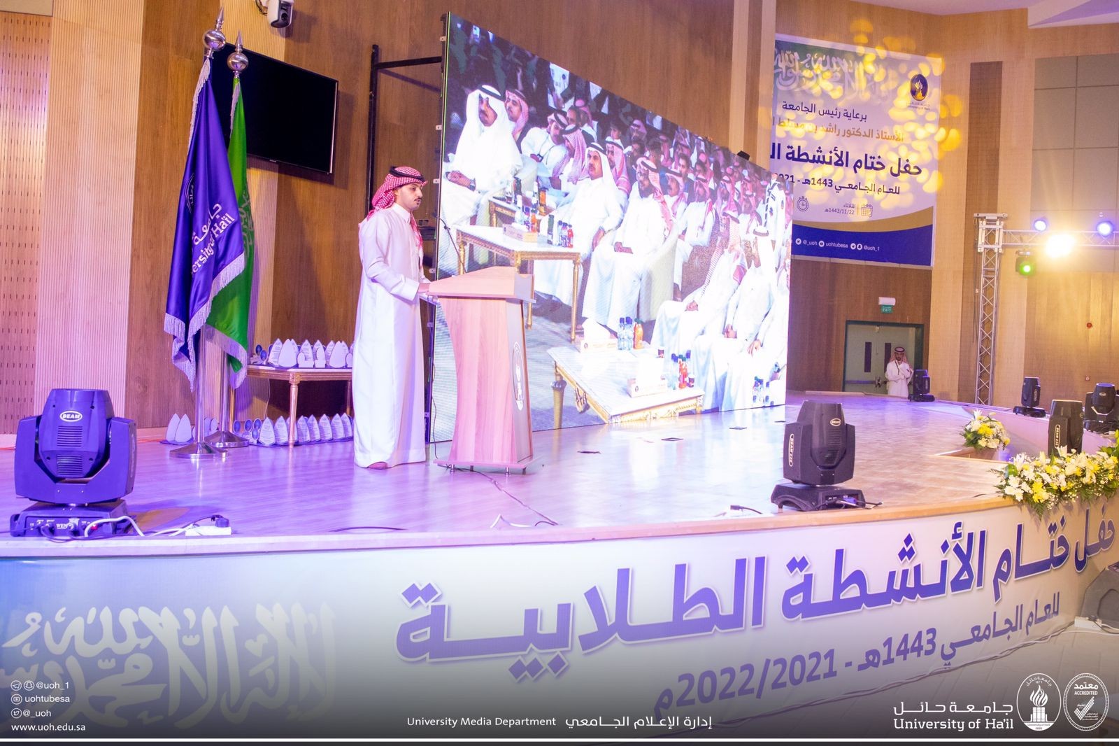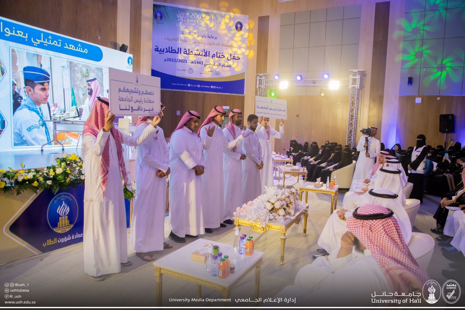 برعاية رئيس جامعة حائل، الأستاذ الدكتور راشد بن مسلط الشريف، أقامت الجامعة ممثلة بعمادة شؤون الطلاب حفل اختتام الأنشطة الطلابية للعام الجامعي ١٤٤٣هـ، بحضور وكلاء وعمداء الكليات والعمادات، ومشرفي ومشرفات الأنشطة الطلابية، والطلبة، وذلك على مسرح رقم (١) في الكلية التطبيقية بالمدينة الجامعية.