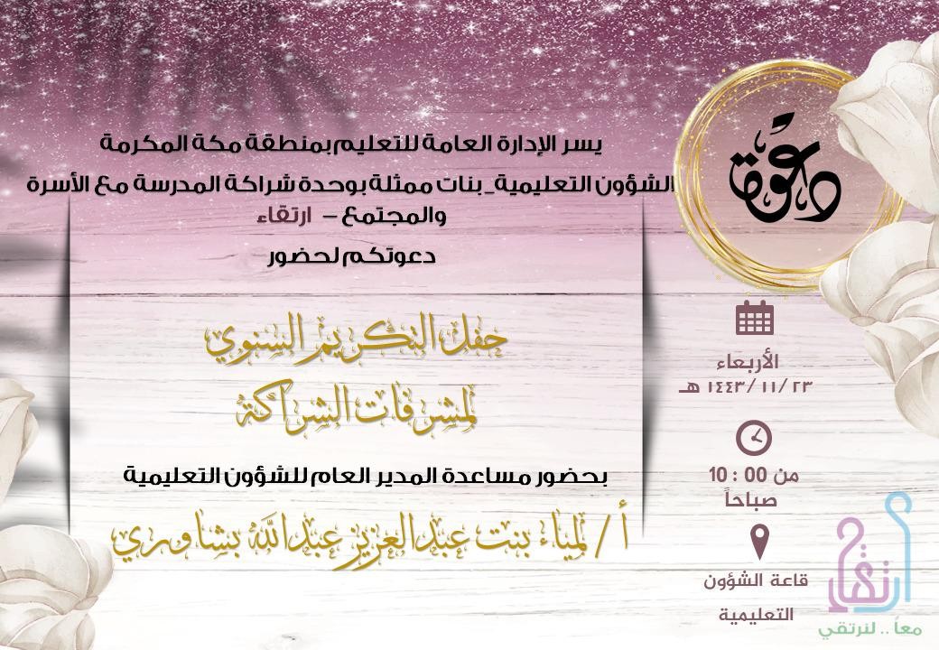 عقدت الإدارة العامة للتعليم بمنطقة مكة المكرمة ممثلة في وحدة شراكة المدرسة مع الأسرة والمجتمع (ارتقاء ) بنات يوم الأربعاء الموافق ١٤٤٣/١١/٢٣هـ اللقاء الختامي لحفل التكريم السنوي لمشرفات الشراكة المنسقات في الإدارات ومكاتب التعليم والمشرفات المتطوعات لتدريب أولياء الأمور وتنفيذ حلقات النقاش ورائدات الشراكة في المدارس ورياض الاطفال خلال الفصل الدراسي الثالث ١٤٤٣هـ نفذته وحدة ارتقاء تحت إشراف مديرة الوحدة بدرية الغامدي .