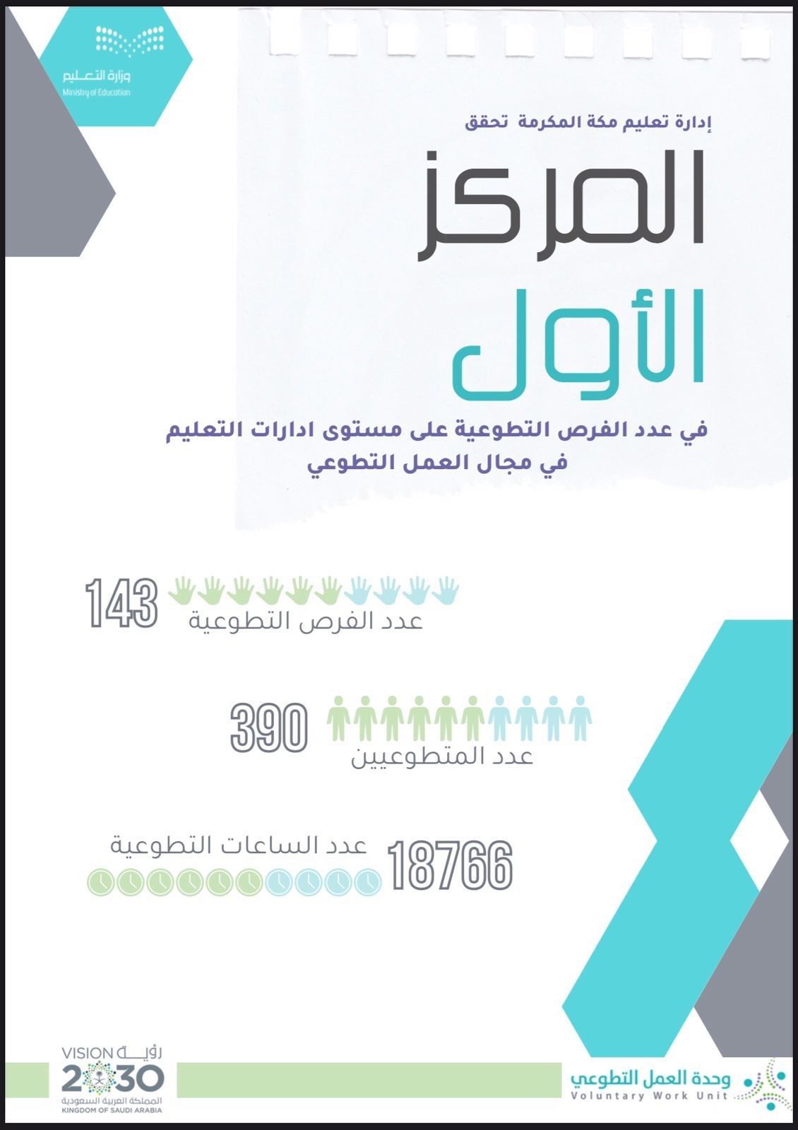 حققت الإدارة العامة للتعليم بمنطقة مكة المكرمة ممثلة بإدارة الموارد البشرية / وحدة التطوير (العمل التطوعي) المركز الأول في عدد الفرص التطوعية ومراكز متقدمة في أعداد المتطوعين والساعات التطوعية.
