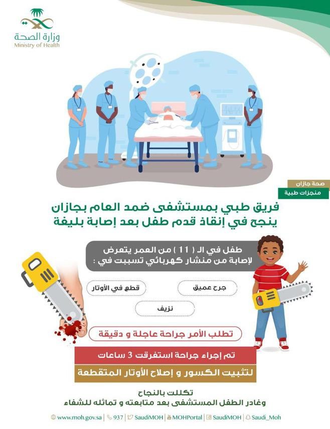قالت صحة جازان بأن فريقًا طبيًا بمستشفى ضمد العام تَمَكّن و-لله الحمد- من إنقاذ أصابع قدم طفل في الحادية عشر من العمر يعاني من إصابة بليغة في قدمه.