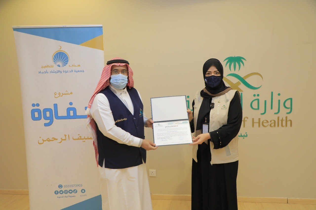 سلّمت جمعية الدعوة والإرشاد وتوعية الجاليات بأجياد في مكة المكرمة اليومَ، 400 حقيبة للعناية الصحية للمديرية العامة للشؤون الصحية بمكة المكرمة وذلك للاستفادة منها المرضى المنومين في مستشفيات مكة المكرمة والمشاعر المقدسة من خلال مشروع عافني ضمن مبادرة "حفاوة ضيف الرحمن" التي تنظمها الجمعية في عامها الخامس، يأتي ذلك تفعيلا للشراكة المجتمعية التي تمت بين الجهتين لتنفيذ برامج توعوية مشتركة.