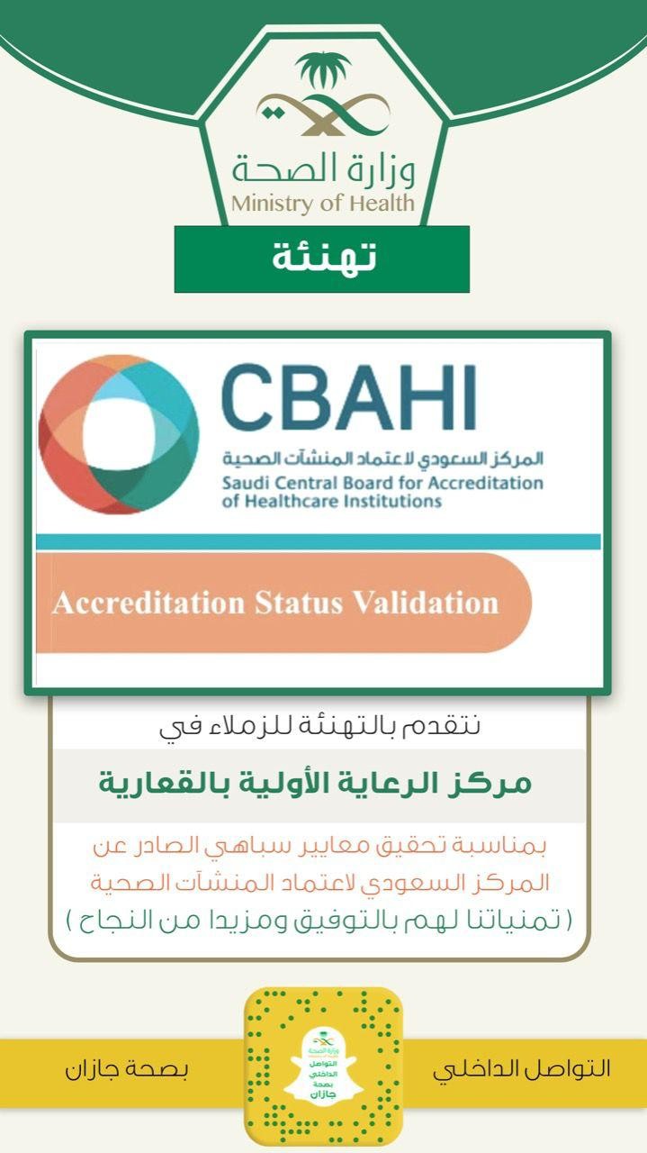 حقَّق مركز صحي القعارية بجازان شهادة اعتماد المركز السعودي لاعتماد المنشات الصحية " سباهي " ، فيما حقق مركز صحي القعارية الاعتماد الكامل وتحقيق شهادة الاعتماد، وذلك بعد نجاحها في تحقيق معايير المتطلبات الأساسية للسلامة، والالتزام بتطبيق معايير الجودة، واجتياز التقييم الشامل وسلامة المرضى في الرعاية الصحية الأولية.