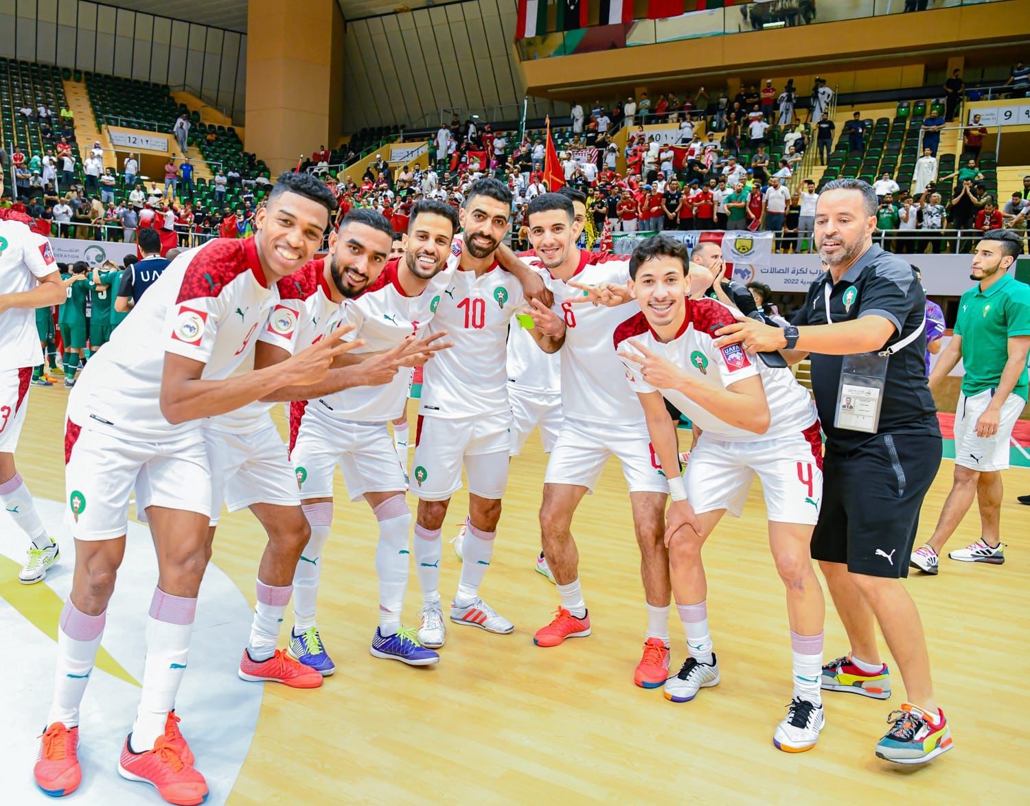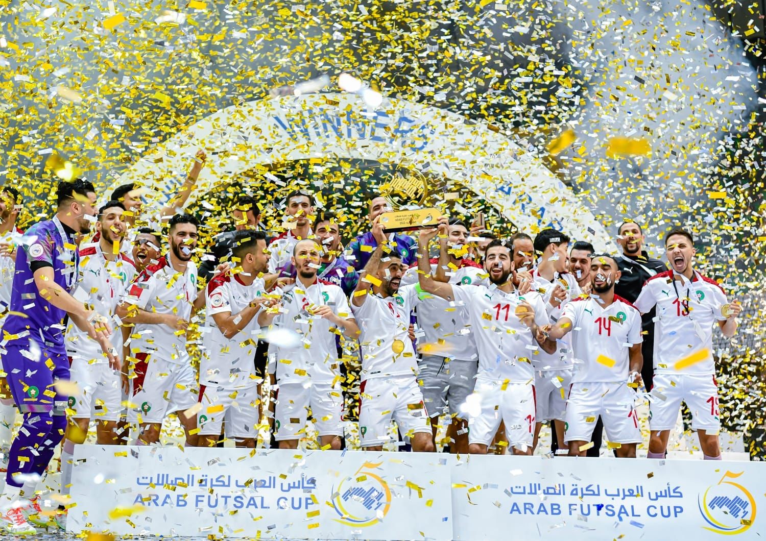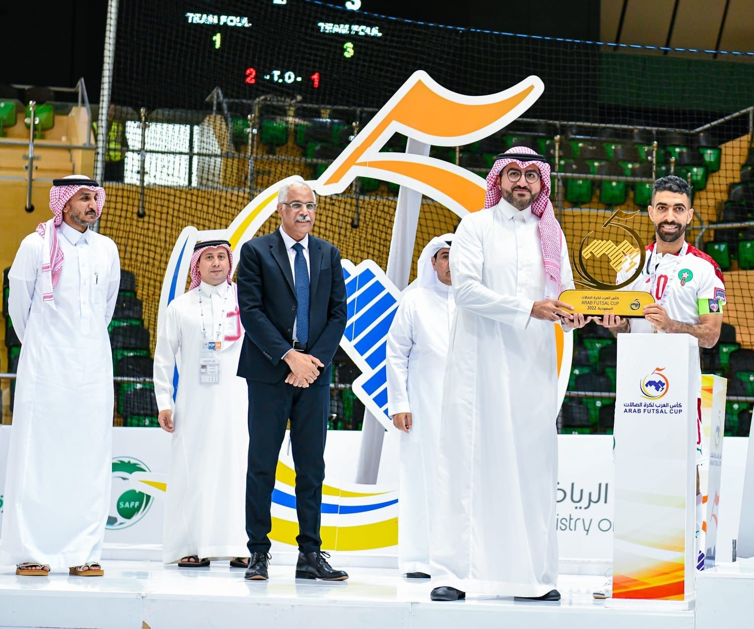 توج معالي نائب وزير الرياضة بالمملكة العربية السعودية الأستاذ بدر بن عبدالرحمن القاضي، منتخب المغرب بكأس البطولة العربية لكرة قدم الصالات 2022، بعد المباراة الختامية التي أقيمت مساء امس الثلاثاء في صالة وزارة الرياضة بمدينة الدمام.