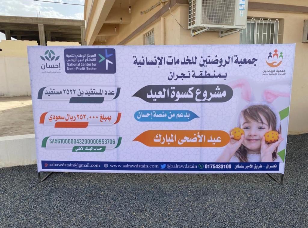 نفّذت جمعية الروضتين بمنطقة نجران بالتعاون مع منصة إحسان مشروع كسوة العيد لعيد أضحى هذا العام وذلك ضمن برامجها الذي تهدف إلى تقديم خدمات نوعية للأسر المحتاجه تعليميًّا وإغاثيّا وتنمويًّا ومعيشيًّا .