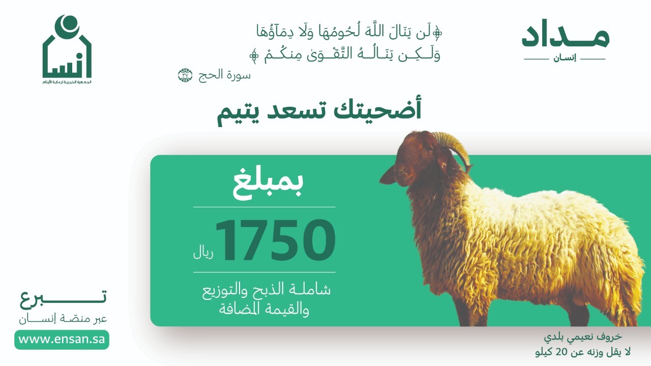 أطلقت الجمعية الخيرية لرعاية الأيتام بمنطقة الرياض "إنسان" حملة الأضاحي لهذا العام تحت شعار" أضحيتك تسعد يتيم" وتعتزم الجمعية توزيع 1257 أضحية، تستفيد منها أسر الجمعية البالغ عددها أكثر من 10 آلاف أسرة، وأوضحت الجمعية أنها أبرمت اتفاقية مع إحدى الشركات الوطنية المتخصصة، وذلك لتأمين احتياجات الجمعية من الأضاحي ( خروف نعيمي ) حيث شكّلت الجمعية لجنةً للإشراف على تنفيذِ المشروع والتحقق من مطابقة الأضاحي للمواصفات الشرعية، ومعاينة الأضاحي قبل ذبحها.