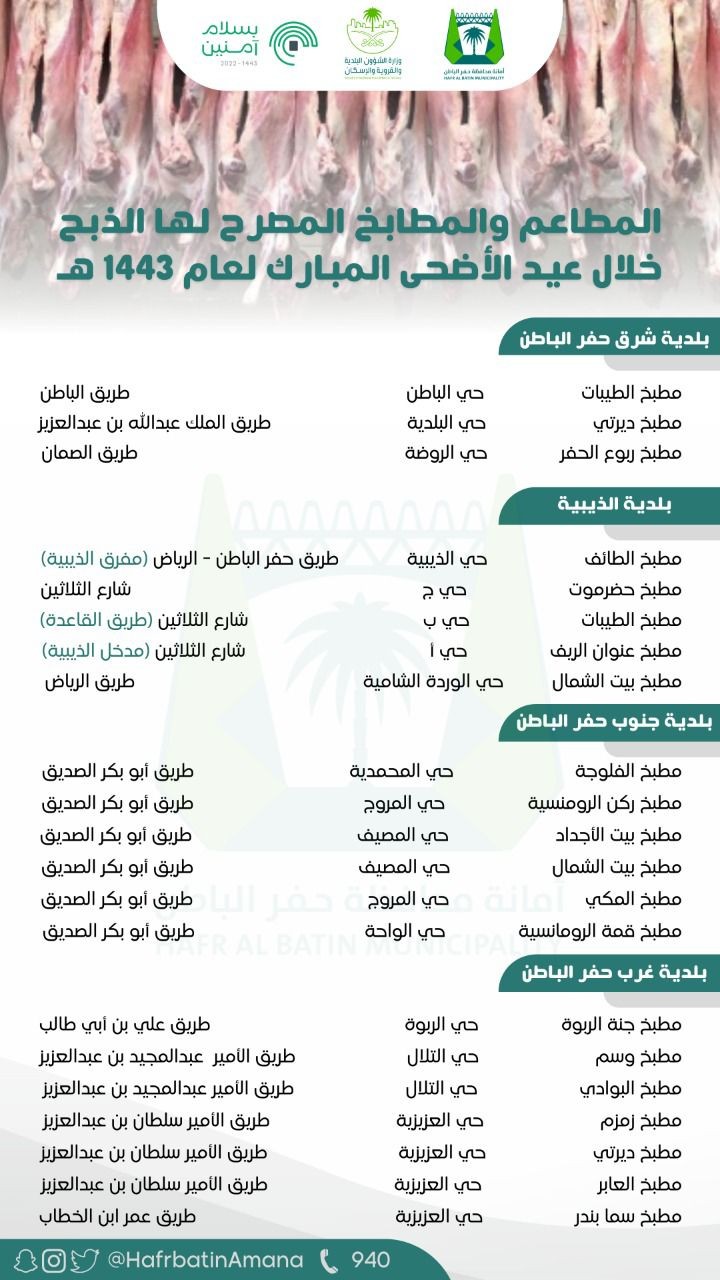 وبيّن مدير العلاقات العامة والإعلام سعود بن عويضة الصقري، في الأمانة جاهزية المسالخ المصرح لها في المحاظة لاستقبال المواطنين والمقيمين والتي يبلغ عددها 21 مطبخ ومطعم في أنحاء متفرقة من حفر الباطن وضواحيها ..