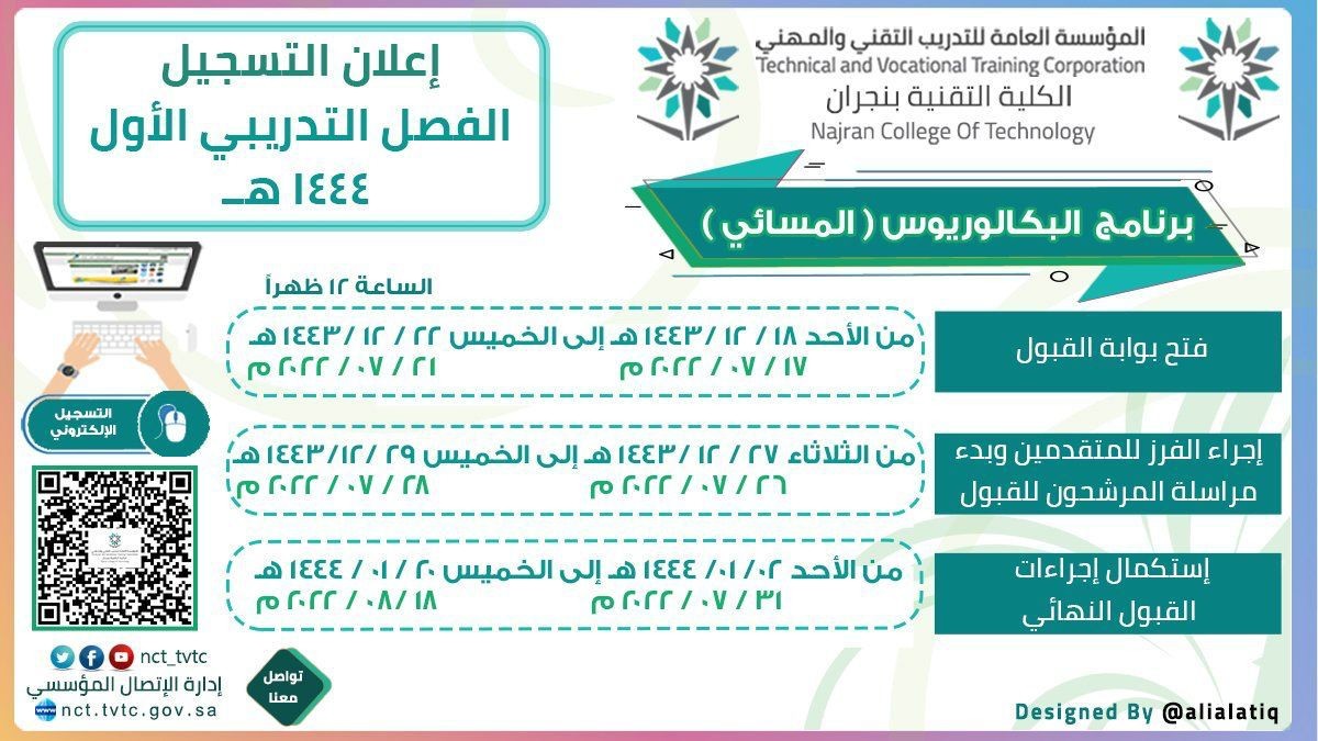 بدأت الكلية التقنية بنجران اليوم بإستقبال طلبات القبول في برنامج البكالوريوس المسائي للفصل التدريبي الأول من العام التدريبي 1444 هـ، ويستمر حتى 22 من الشهر الجاري.