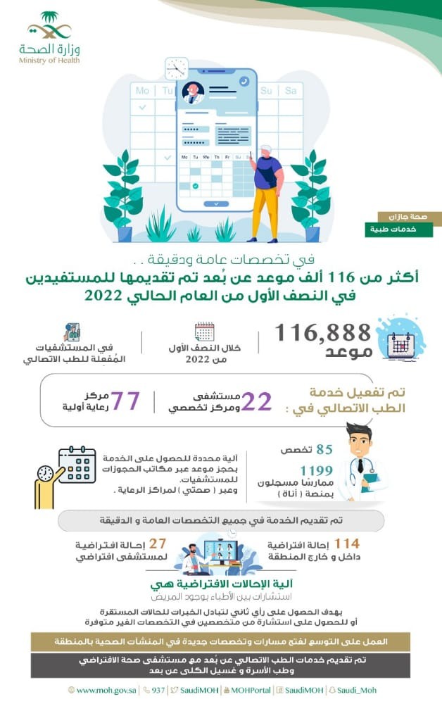 قالت صحة جازان بأن عدد المواعيد عن بُعد التي تم تقديمها خلال النصف الأول من العام الحالي 2022م بلغ 116,888 موعد موزعة بين المنشئآت المُفعِله للطب الاتصالي.