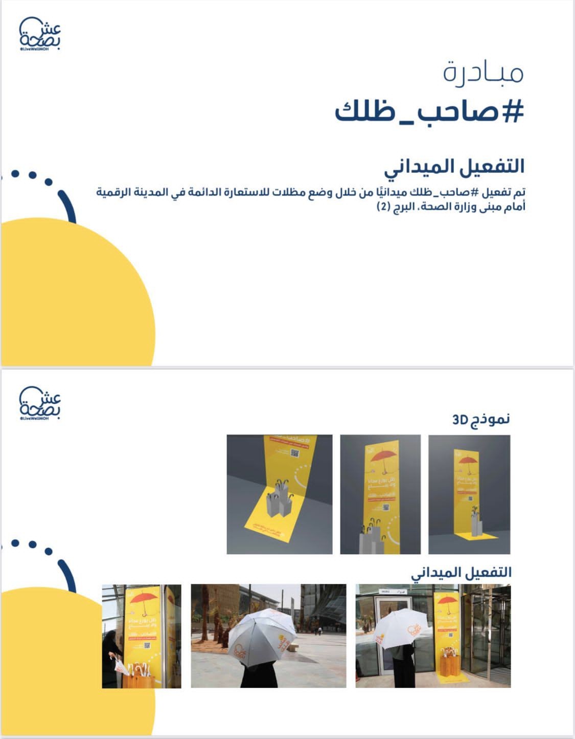 شاركت جمعية عيون جدة في مبادرة "صاحب ظلك "التي تنظمها منصة "عيش بصحة" التابعة لوزارة الصحة ويدشنها مجمع إرادة والصحة النفسية ممثلا في إدارة العلاقات العامة والاعلام والتوعية الصحية و قسم التغذية ، وهذه المبادرة تعني بأهمية الصحة العامة للفرد وضرورة اصطحاب المظلات الشمسية و الاكثار من شرب الماء مع تحديد الأوقات المناسبة للخروج من المنزل بما يتزامن مع انخفاض درجات الحرارة والبعد عن التعرض لضربات الشمس حيث قام فريق جمعية عيون جدة بالمشاركة ميدانيا في ممشى حي الفيصلية وذلك من خلال تعزيز سلوك استخدام المظلات الشمسية وترطيب الجسم بالسوائل وغيرها من السلوكيات الإيجابية في فصل الصيف.