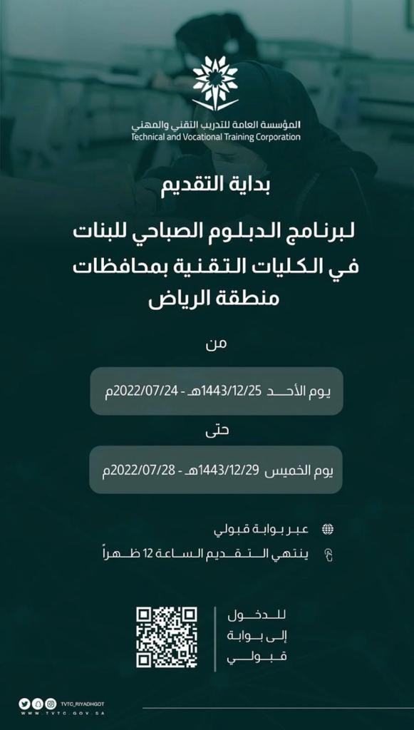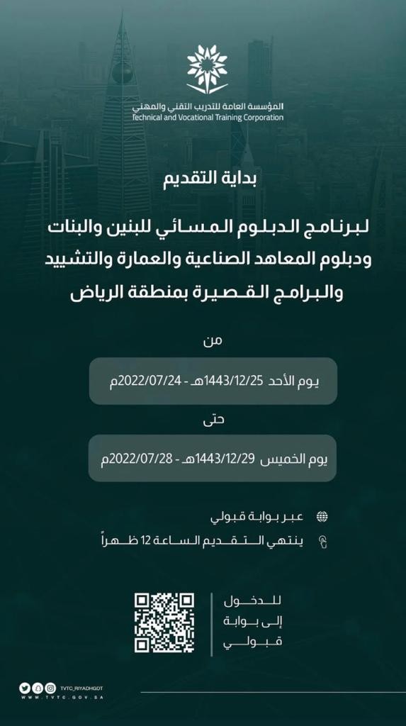 ويمكن للراغبين التقديم عبر بوابة "قبولي" الخاصة بالمؤسسة العامة للتدريب التقني والمهني؛ حيث ينتهي التقديم الخميس 29 ذي الحجة الموافق 28 يوليو الجاري في تمام الثانية عشرة ظهرًا.