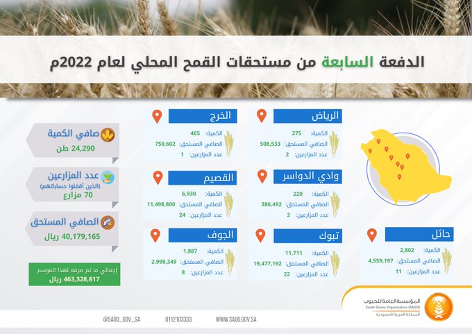 أعلنت المؤسسة العامة للحبوب، صرف مستحقات الدفعة السابعة من مزارعي القمح المحلي اللذين قاموا بتوريد الكميات المخصّصة لهم لهذا الموسم 1443 / 1444هـ، وإغلاق الحسابات عبر المنصة الإلكترونية "محصولي" على الموقع الرسمي للمؤسسة.