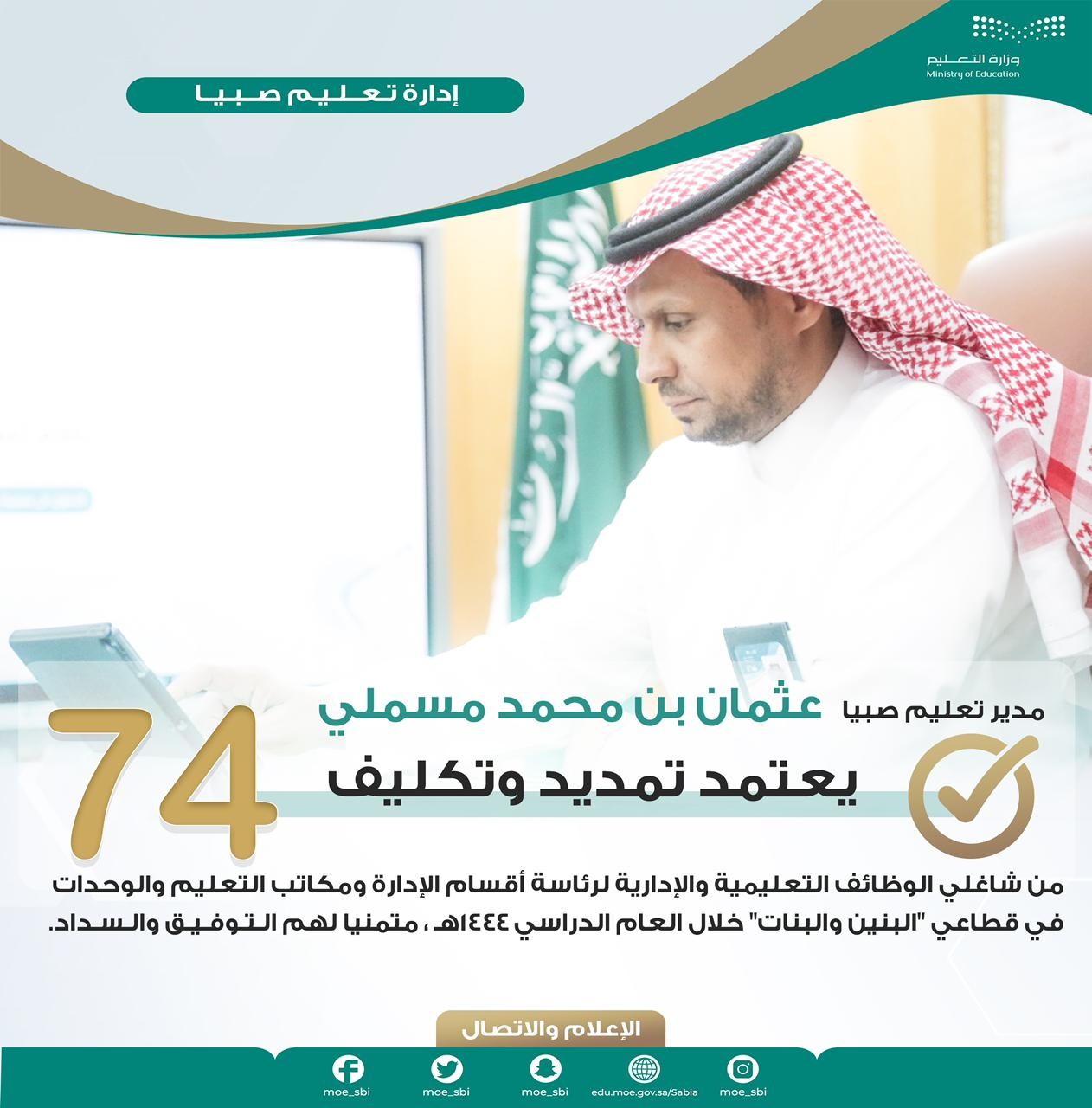 اعتمد مدير تعليم صبيا عثمان بن محمد مسملي، عددًا من التكليفات وقرارات التمديد لما يزيد عن 74 من شاغلي الوظائف التعليمية والإدارية بناءً على ما أوصت به لجنة اختيار القيادات بالإدارة.