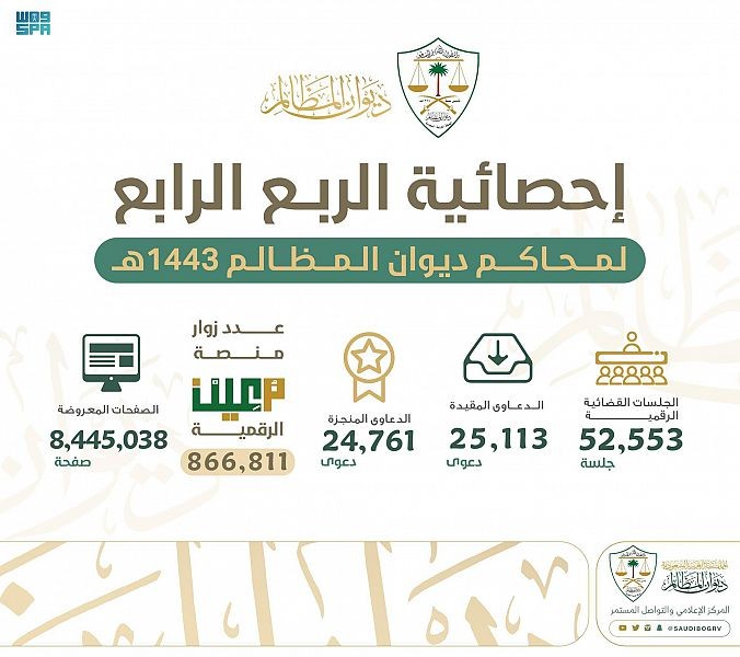 وشمل التقرير الذي أصدره ديوان المظالم للربع الأخير من العام الهجري 1443هـ، على عدد الدعاوى المقيدة والمنجزة وجلساتها بالمحاكم الإدارية، حيث تم بلغت الدعاوى المقيدة خلال الفترة بلغ 25113 دعوى، فيما بلغ عدد زوار منصة معين الرقمية 866811 زائرًا، تصفحوا خلالها 8,445,038 صفحة معروضة.