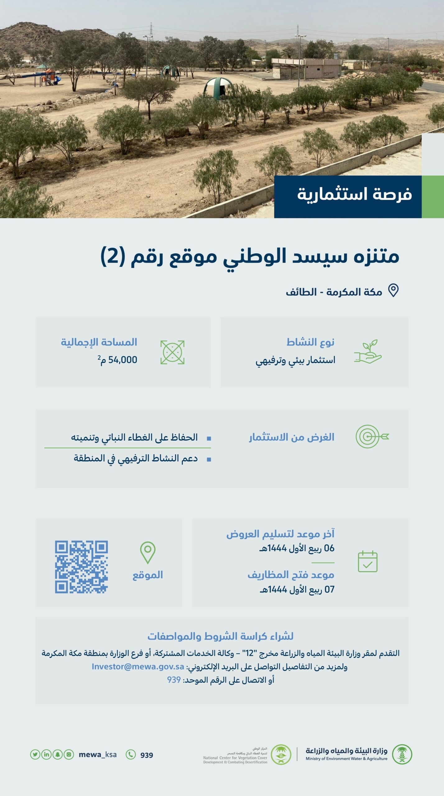 اعلنت وزارة البيئة والمياه والزراعة عن طرح فرصة استثمارية بهدف الحفاظ على الغطاء النباتي وتنميته في متنزه سيسد الوطني موقع رقم (2).