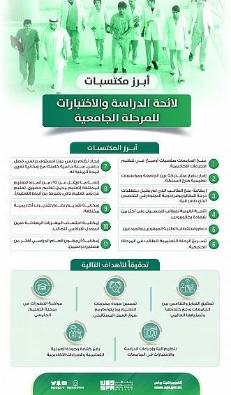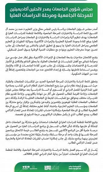 يُشار إلى أنه سيتم العمل بلائحة الدراسة والاختبارات للمرحلة الجامعية، واللائحة المنظمة للدراسات العليا في الجامعات، ابتداء من بداية العام الدراسي القادم 1444هـ.