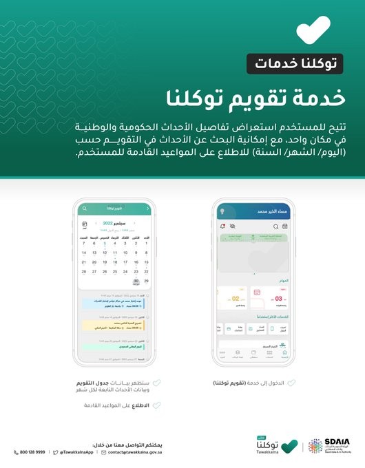 وأوضح أن الخدمة تتيح للمستخدم استعراض تفاصيل الأحداث الحكومية والوطنية في مكان واحد، مع إمكانية البحث عن الأحداث في التقويم حسب اليوم، والشهر، والسنة و أن الحصول على الخدمة يتم من خلال الدخول إلى تقويم توكلنا، وستظهر بعدها بيانات جدول التقييم، وبيانات الأحداث التابعة لكل شهر؛ ومن ثم الاطلاع على المواعيد القادمة.