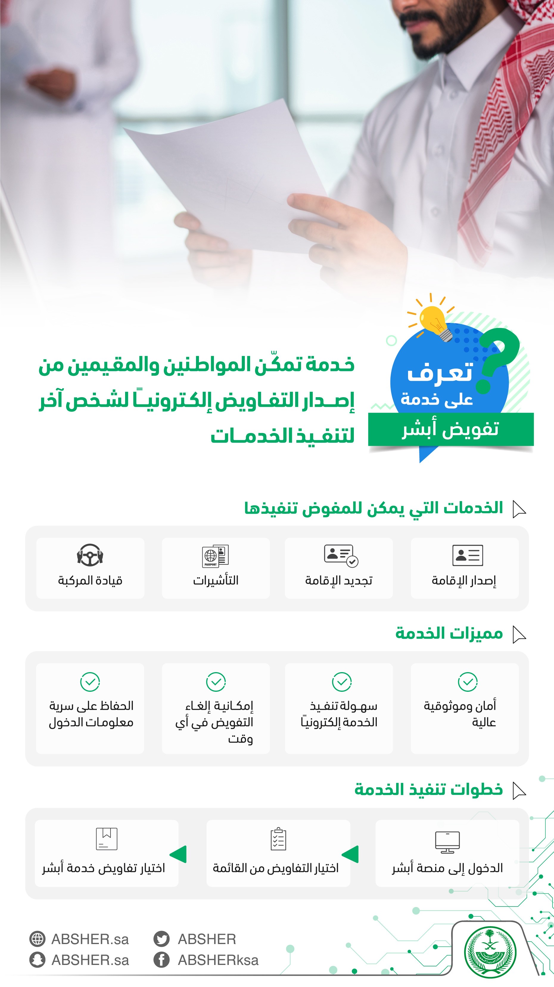 “أبشر” توضح 4 خدمات يمكن تفويض أحد الأشخاص لتنفيذها نيابة عن المُستخدم