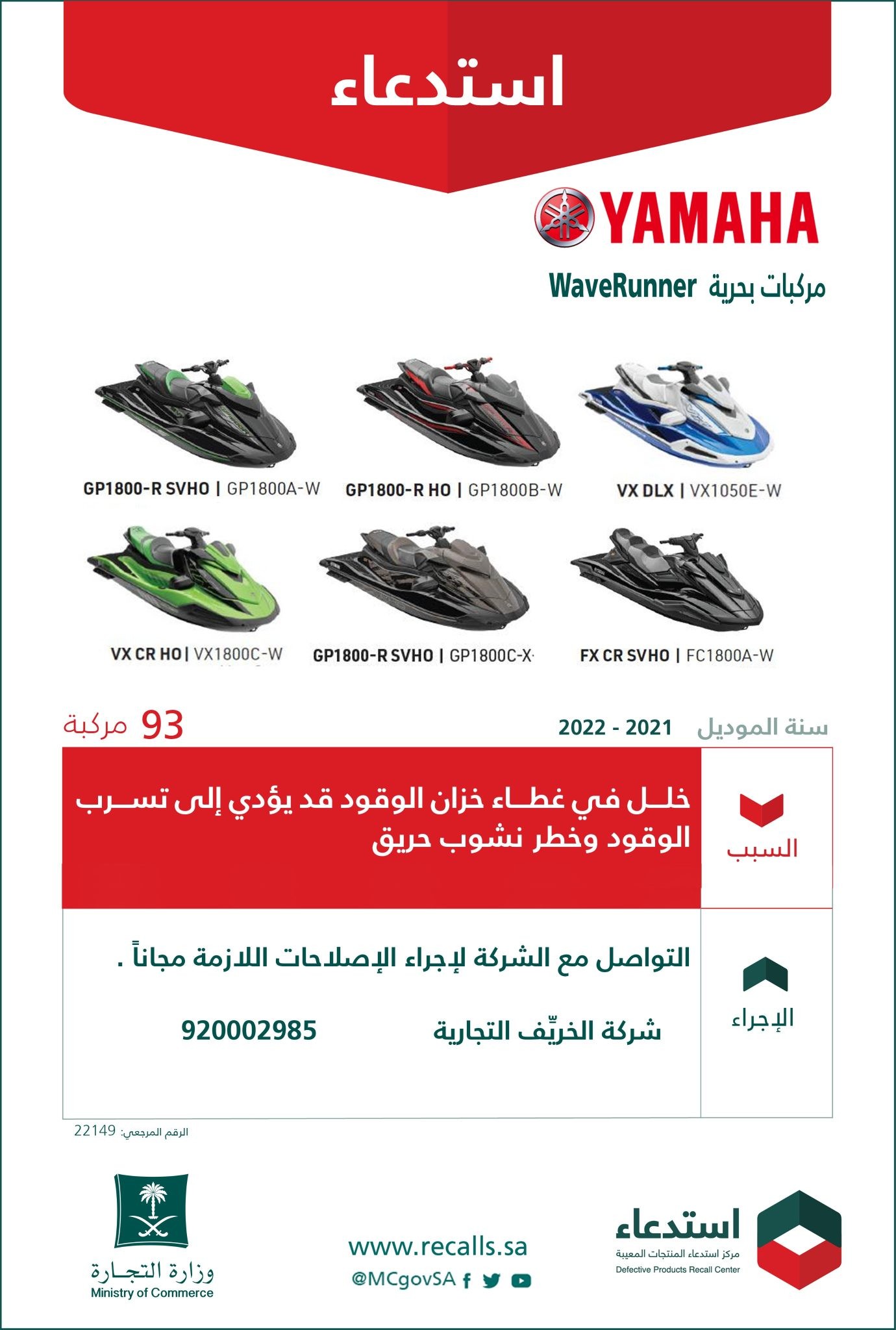 أعلنت وزارة التجارة، اليوم الاثنين، عن استدعاء 93 مركبة بحرية “YAMAHA “WaveRunner” عدة طرازات (2021 – 2022).